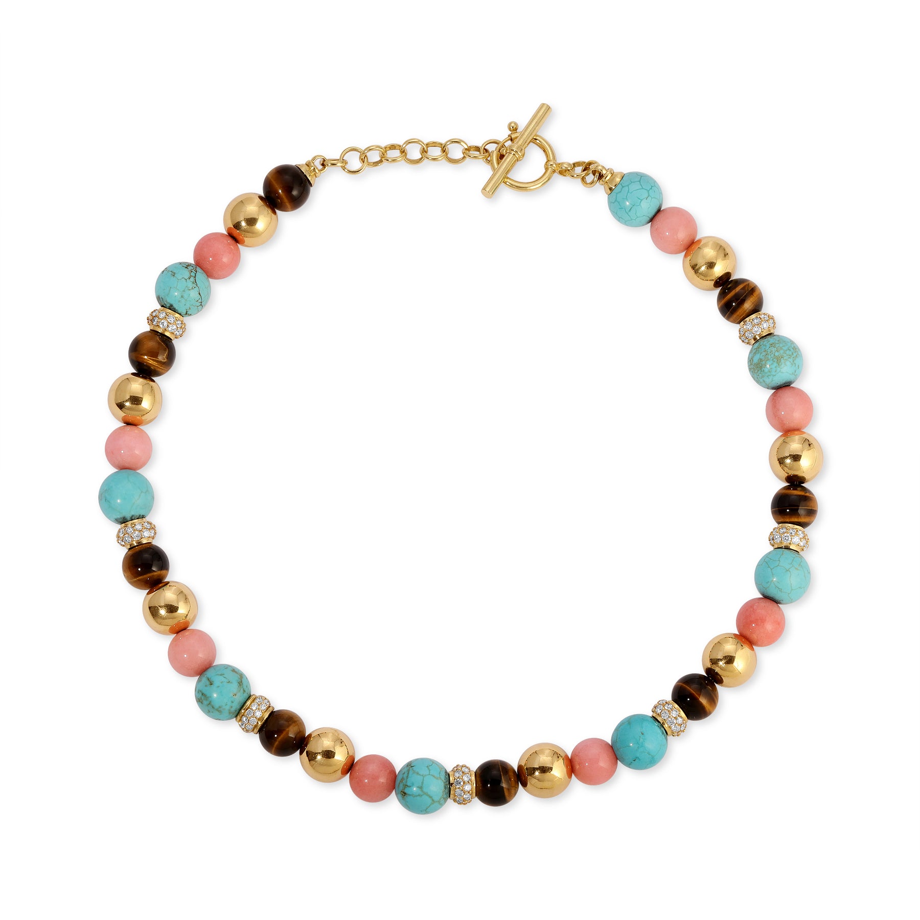 18K Yellow Gold, Diamond, Turquoise, Tiger's Eye, and Coral
