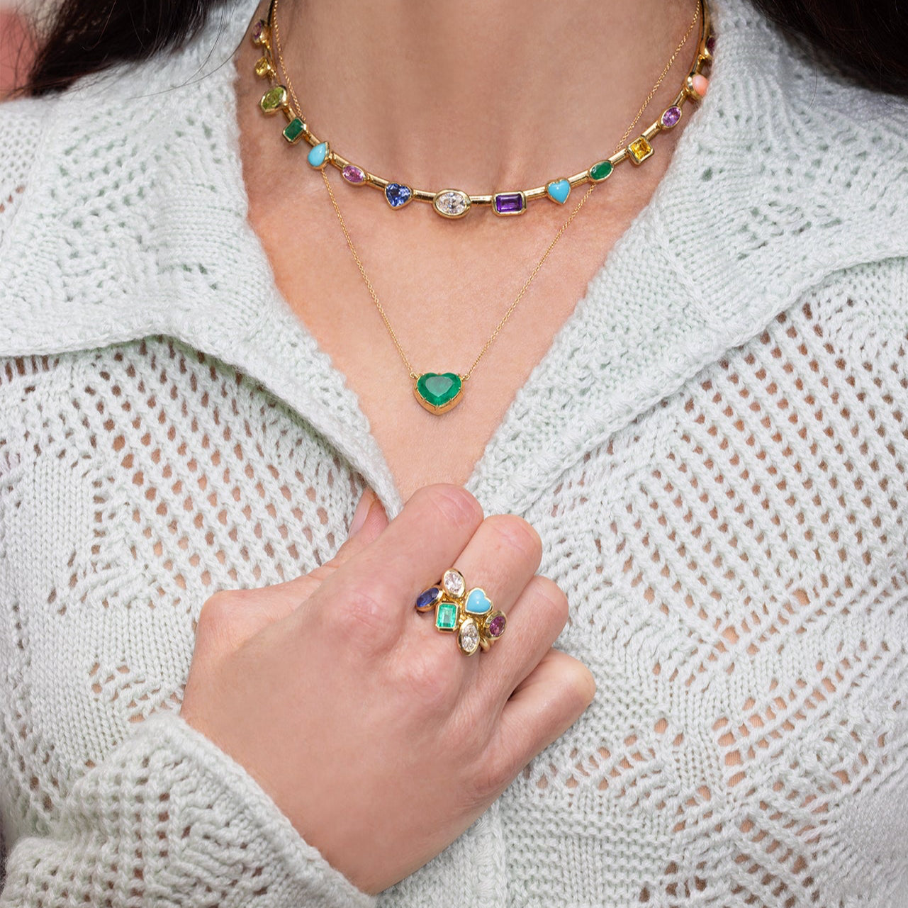 18K Yellow Gold, Diamond, Emerald, Pink Sapphire, Blue Sapphire and Turquoise