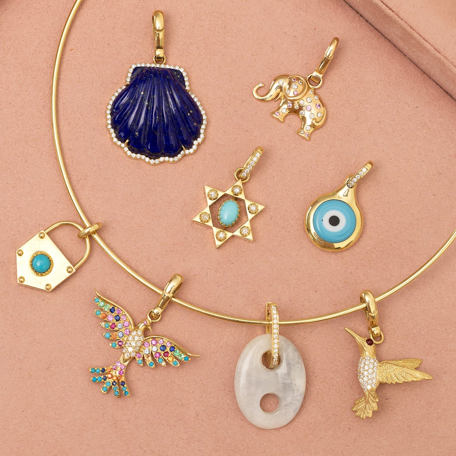 18K Yellow Gold, Diamond, Turquoise, Malachite, Amethyst, Mother of Pearl, Lapis, Dendrite Opal, Strawberry Quartz, Trolleite, or Chrysoprase